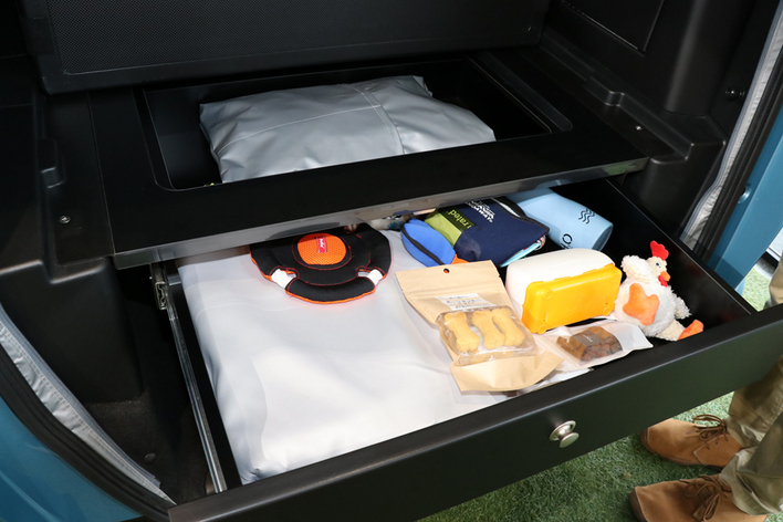 さらに、ラゲッジルーム内にはビルトイン式のウォーターサーバーも設置されると同時に、ラゲッジ下部にはプラスチックの引き出しを装備。ワンちゃんのオモチャなども格納できるスペースを用意している。