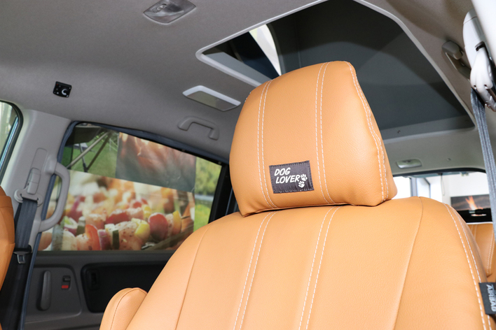 さらに、車内の2列目からラゲッジルームにかけては、犬の毛が付着しにくい特別仕様のクッションマット(合皮)を敷くことでフルフラットのエリアが生まれることによって、ポップアップルーフに2人、室内に2人の4人がラクに車中泊できるようになる。