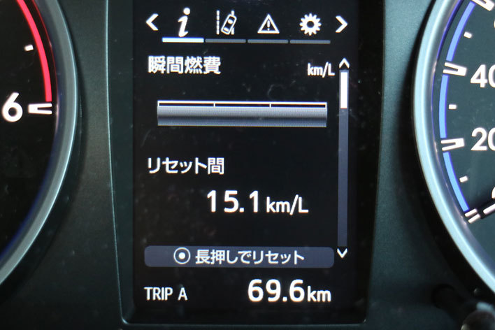 市街地での燃費は、大柄なボディから抱くイメージを大きく上回る12.6km/Lを記録した。市街地ではギアが4速程度までしか上げられないことを考えれば、大健闘といえるだろう。