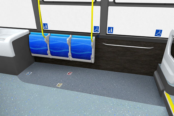 ・モーター走行により変速ショックがないことに加え、急加速を抑制し緩やかな発進を可能とする加速制御機能を採用し、車内で立っている利用者の安全性に配慮した。