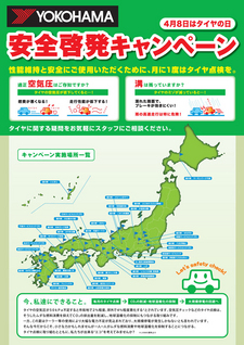 横浜ゴム(株)は、当社の国内タイヤ販売会社である(株)ヨコハマタイヤジャパンを通じて、4月8日の「タイヤの日」に全国36カ所で「ヨコハマタイヤ春の安全啓発キャンペーン」を実施する。