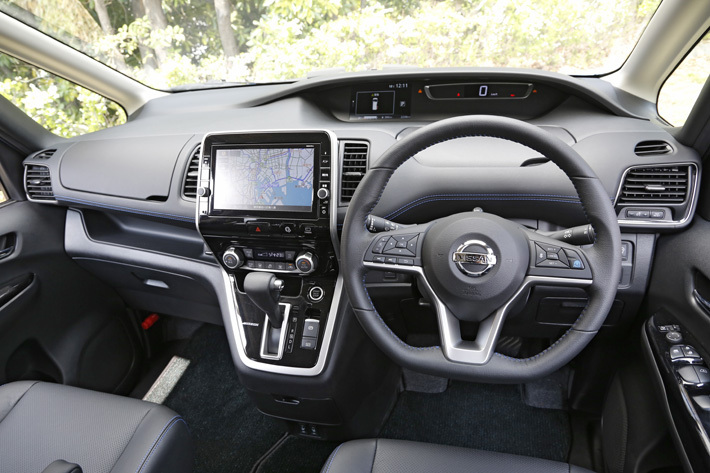 インテリアへと目を移すと、クオリティ感の高いブラックのレザーシートが目に飛び込んでくる。幅広いラインナップを誇るセレナのなかで、レザーシートが用意されるのはセレナAUTECHだけ。