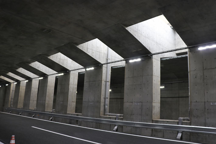 バスに乗って同区間を走る機会を得たが、想像とは違い、さほど”地下”の閉所感がなかった点は意外だった。中央分離帯上部にガラスや幕で覆われた明かり取りを設け、日差しが差し込むようにしたことが大きな要因だ。しかも道路の方角によって覆いの角度を変え、覆い自体も半透明とし日差しが直で来てドライバーを眩惑させないようにするなど、設計時から細かな配慮も加えられているというからさらに素晴らしい。