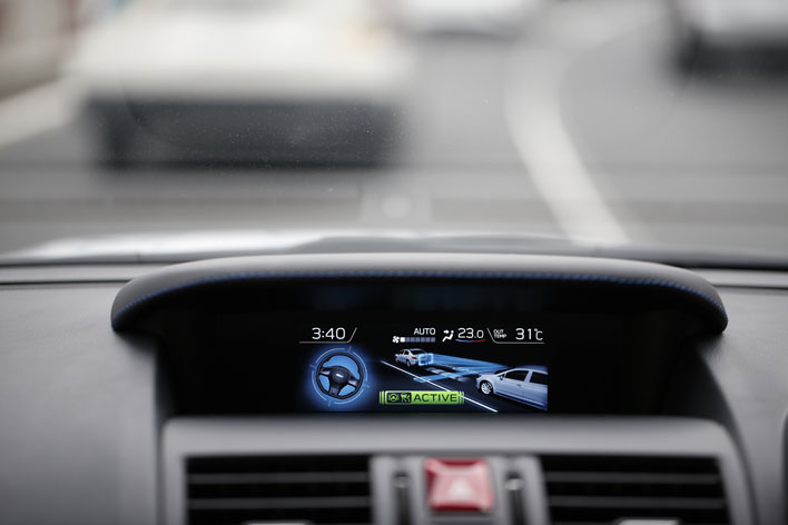 スイッチを入れると、スピードメーターとタコメーター(エンジン回転計)の間にレイアウトされたマルチインフォメーションディスプレイに、先行車とハンドルの絵柄が緑色で表示されて制御が開始されたことを示す。これとは別に先行車と車線を示す青色の絵柄も表示され、2個のカメラセンサーが先行車と車線の両方を検知できていることを示す。この表示と併せて、インパネ中央の最上部に装着されたマルチファンクションディスプレイにもアイサイト・ツーリングアシストの作動状態が表示された。