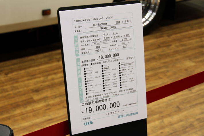 JCCS2018に展示された新型コースターをベースにしたキャンピングカーの中でも、最高峰の一台が、トイファクトリー(岐阜県可児市)が製作する「セブンシーズ」だ。