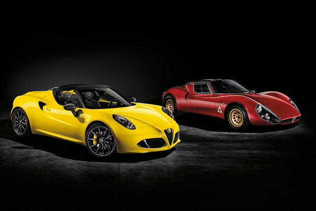 奥は伝説のレーシングマシンTipo 33を基に誕生したスーパースポーツ「Tipo 33/2 Stradale」[1967]。4Cスパイダーにはこうしたアルファロメオ100年の歴史が継承されているのだ。