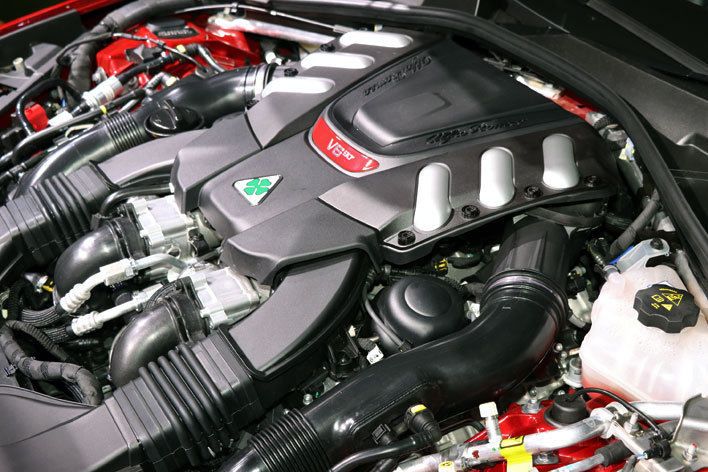 ところで最もパフォーマンスの高い2.9リッターV6ツインターボエンジンだが、これは2015年の最初の発表のときのプレスリリースには“フェラーリをバックグラウンドとする”とか“フェラーリのテクノロジーを”みたいな微妙な表現とともに紹介されていた。排気量は2891cc。1気筒あたり481.8cc。これを8倍にすると、そのままフェラーリ カリフォルニアTの3855ccV8ツイン・ターボの排気量となる。φ86.5のボアも82.0mmのストロークも、ピタリと同じだ。バックグラウンドとかテクノロジーというのは控えめな表現で、フェラーリのV8をV6に縮めてアルファロメオにマッチするようチューニングし直したんじゃないか? と思えるくらいの、マラネロの血がかなり濃厚なパワーユニットであることは間違いなさそうだ。