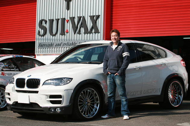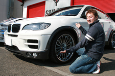 ドリフトドライバーとしての審美眼を生かし、エアロパーツメーカー『カーメイクT&E』の代表でもいらっしゃる上野選手の愛車は、自社エアロとホイールを装着した、BMW X6でした。
