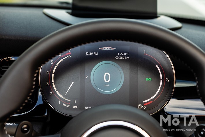新型ミニ コンバーチブルの運転席に座ってみると、ステアリング奥に備わっている楕円形のデジタルメーターが大きく目立ちます。