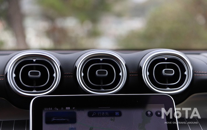 車内に入ると、インパネのデザインが斬新です。試乗車はAMGレザーエクスクルーシブパッケージを装着したので、ブラックのインパネには光沢があり、縦縞が入るなど個性的です。