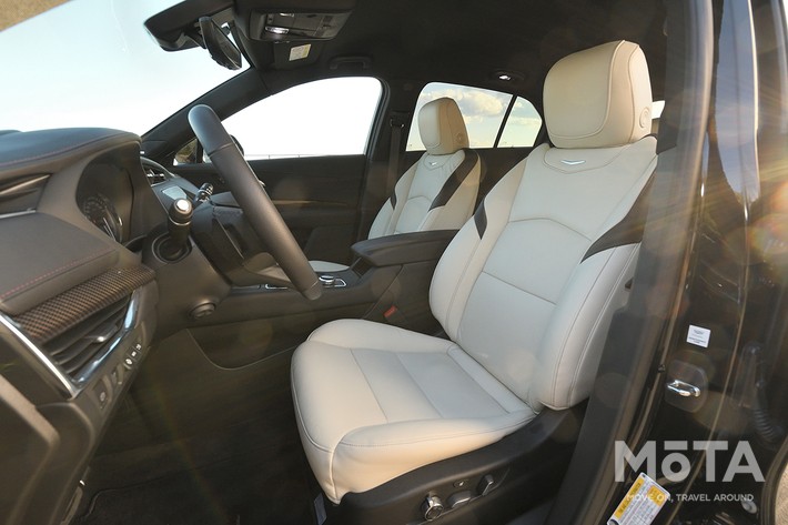 シャープなエクステリアは、最近のキャデラックデザインの文法に則っている。上位に位置する「XT5」との近似性も強く、縦長の細いヘッドライト、大きな逆台形グリル・太いリアピラーの造形とともに、一目見てキャデラックだとわかる個性を持つ。試乗会に来ていたのは、3グレードの中でもスポーティさを売りにする「スポーツ」というグレードだった。
