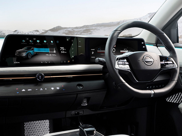 アリアは日産からな第二弾電気自動車です。電気自動車リーフを量産車として、世界で初めて販売を開始し、その蓄積されたノウハウを元に、クロスオーバーSUVとして誕生しました。時間を掛けて開発した事もあり、優れた技術が満載です。エクステリアデザインは、早くから公開されていましたが、実車を見ると改めてその塊感ある意匠に存在感を感じます。インテリアも大きな液晶パネルを連続させた、シンプルかつハイセンスなまとめ方をしています。バックスキン調のアルカンターラ素材を使って、落ち着きある質感高い縫製で、シートやインパネに表情を持たせています。