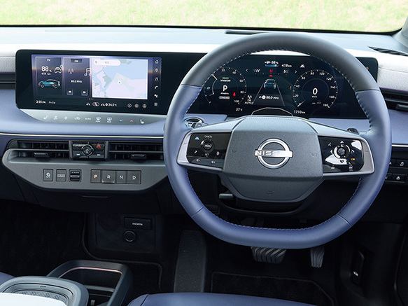 少々野暮ったいデザインだった初代から精悍で筋肉質なイケメンルックに大変身しました。キックアップしたウエストラインでとても躍動感に溢れています。リアバンパー下はディフューザー形状になっていて空力も計算してるんでしょうね。ボディカラーはホワイトとブラックの2トーンがとても素敵に見えました(試乗車)室内は本皮ステアリングのステッチ、フロアマットの縁取り、シフトノブ、メーターリングに綺麗なブルーがアクセントとしてあしらわれてブラック基調のインテリアに映えますね。先進的な電気自動車にピッタリなカラーの組み合わせだと思います。バッテリー容量が拡大されたEVシステムは先代より遥かに強力な加速感を感じさせ思わ....続きを読む