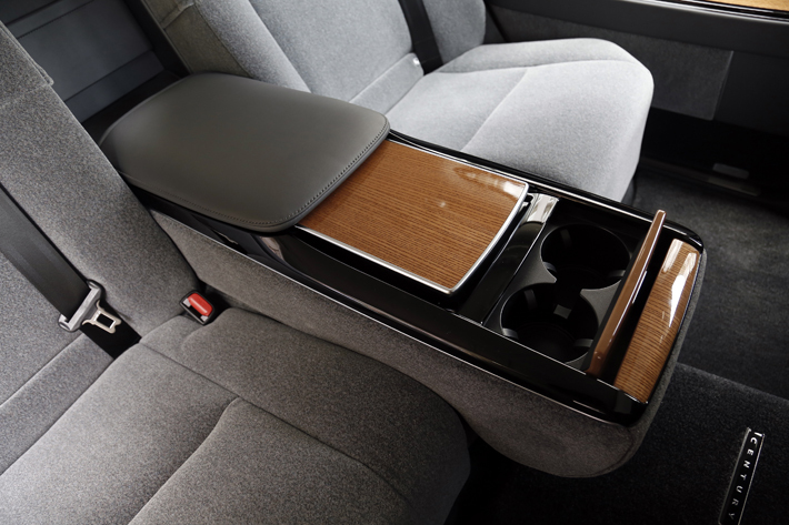 センチュリーのエクステリアデザインは、センチュリーのDNAを引き継ぎながら、近代的なエッセンスで纏められた澱みの無いデザインです。膨よかな面構成ではなく、やや直線的で威風堂々とした佇まいです。外装色は4種類で、漢字での呼び名が与えられています。エターナルブラックの神威、シリーンブルーマイカの摩周、ブラキッシュレッドマイカの飛鳥、レイディエンドシルバーメタリックの精華と実に見事なネーミングです。日本語の美しさや響や漢字の美しさを感じます。インテリアで先ず目に止まるのが、ファブリックシートです。センチュリーは、代々ファブリックシートに力を入れています。上質で滑らか且つ、相反する滑り止め作用もあり、車のシート生地としてベストマッチなマテリアルです。本杢パネルとグレーファブリックの組み合わせは、センチュリーの世界観を感じます。