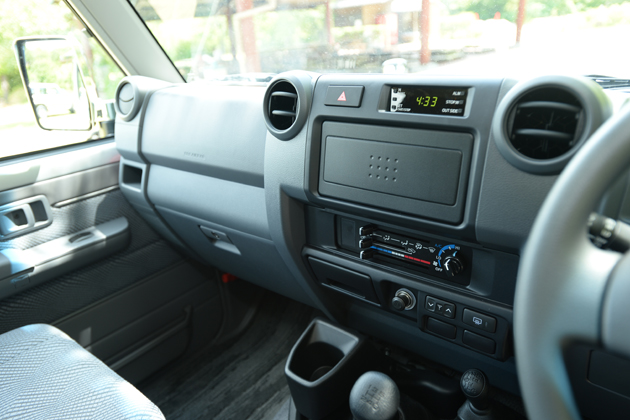 ランドクルーザー70は、その頑丈で重厚な外観からも分かるように、本格的なSUVであることが一目瞭然です。矩形モチーフのフロントグリルと角に丸みを帯びたフォルムが特徴的で、あらゆる場面でその存在感を示すことができます。内装はシンプルかつ実用的で、ハードなオフロード走行にも対応できるように設計されています。グローブを付けたままでも、各部を操作出来るスイッチ類になっています。