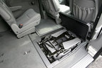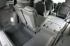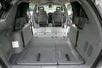 3列あるボイジャー。2列目と3列目を倒してフラットにした場合、4550Lものカーゴスペースが出現する。理由は、シートを床下に完全格納するからである。操作も30秒といたって簡単。手順を説明すると、ヘッドレストを下げ、背もたれを前に倒す。ここまでは2列目3列目も一緒。このあと2列目の場合、後方にスライドさせ、床面のふたをあけて、シートを前にゴロッと倒し入れ込む。3列目の場合はバックエントリーよろしく、後ろに倒す。この簡単な操作で、いままでのミニバンではありえなかった、ワイドなスペースが現れる。ちなみに、このシートを格納するスペースは、シートを使っている場合でも、収納スペースとして利用可能となる。これだけでも、340Lもある。