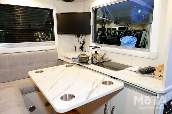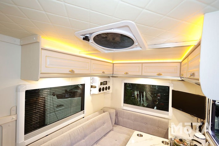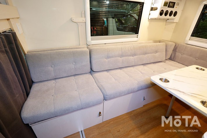 車内にはシンクとL字型のソファが備わり、運転席・助手席以外の乗員は、このソファに座って移動する。そのため、ソファにもちゃんとシートベルトを持つ。収納は豊富で、ソファ下とキャビン上部に合計9箇所を備えている。