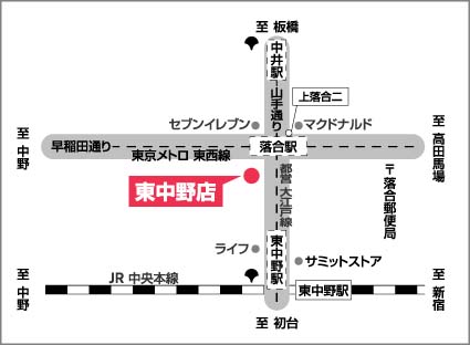 東中野店は山手通り沿い、駅真上の便利な店舗です。 キッズコーナーやベビールーム完備、駅真上のショールームでお迎えいたします。近くにスーパーマーケットが2店舗とお買い物がしやすく、女性に便利なお店です。ぜひご家族でお越しください!山手通り外回り沿い落合交差点南側です。【最寄駅】東京メトロ東西線「落合駅」徒歩1分、 JR総武線「東中野駅」徒歩5分