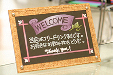 店内は、まるでディーラーとは思えないようなインテリアになっています。インテリアデザインは、当社車両担当の重役がこだわりを持って全て自ら手掛けました。今までのカローラ店にはないカラフルで暖かいカラーの店内。屋根や外装は、カローラ店共通のオレンジカラーです。また、メッセージボードは女性社員によるチョークアートを手書き風に印刷したものです。このメッセージボードは店内を暖かい雰囲気にしてくれます。