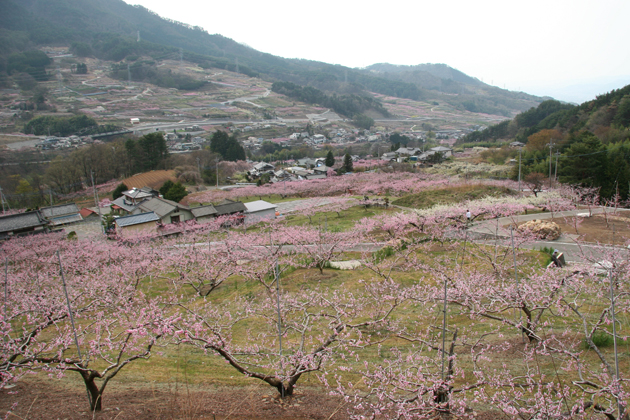 桃の花が咲き誇る春の笛吹市周辺の様子
