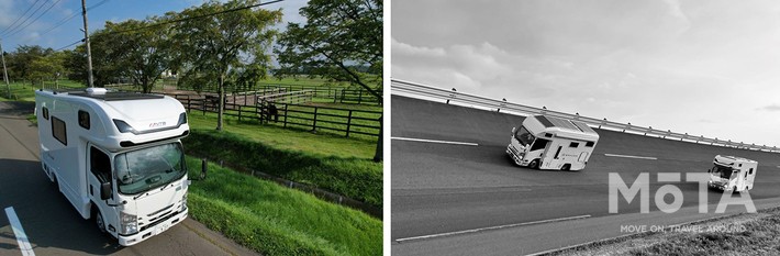 その堂々とした姿は、さらに幅をスライドさせて拡張することで、中に入ると広いフロアに大型のソファー、普通サイズのコンロや洗濯機、トイレやシャワールームに大型のベッドと、もはや高級な別荘。アメリカでは「モーターホーム」と呼ばれる大型キャンピングカーだが、まさに「動く家」の実物が会場に登場する。
