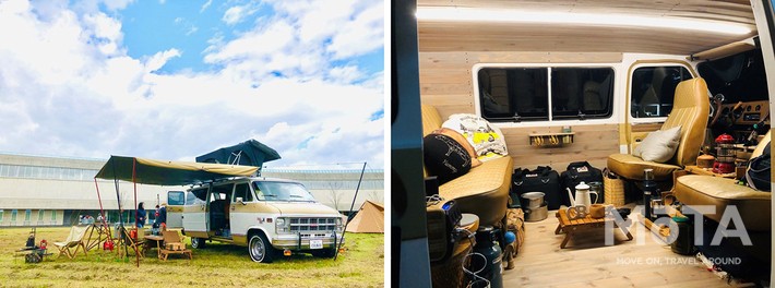 1979年製GMCのVANタイプをベースとし、走るための機関のレストーション(修復)や、内装はリアルウッド貼り、ベッドやリビングとなるスペースも確保。一方でキャンプを楽しむために、あえてキッチンなどの重装備は省き、空間の雰囲気と日常の使い勝手を両立できるよう製作。家族での宿泊も考慮してルーフにはインナーテントを装備した電動ルーフテントも装備する。