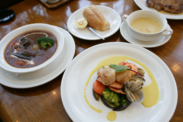 オススメの鹿児島産黒豚のソテーCAJUN風と、野菜たっぷり牛すね肉のシチュー、牛テールの煮込み、帆立とシーフードの野菜添えを注文。もちろんひとりで食べたわけじゃないですよ、念のため。
