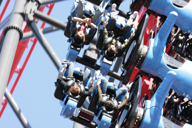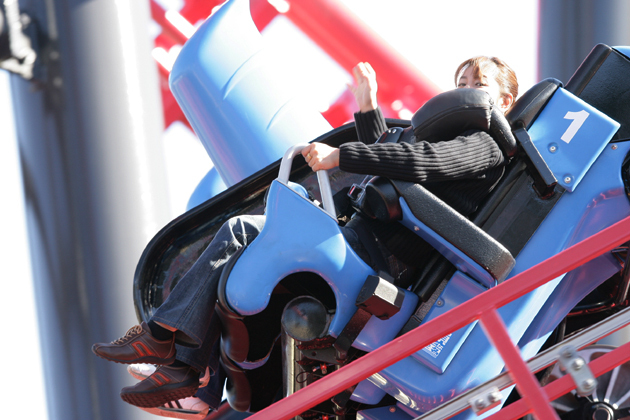 全長1.153m、高さ76m、時速126km。座席が前後方向に回転、ループして大宙返り、ひねりが入って回転という、3種の回転要素。後ろ向きにスタートしたと思ったら、いきなり急角度で落下、ねじたりしながら座席もグルリと大回転。後ろ向きかと思ったら、今度は前向き。オマケに足はブラブラ状態なので、踏ん張りはまったく利かない…。