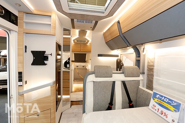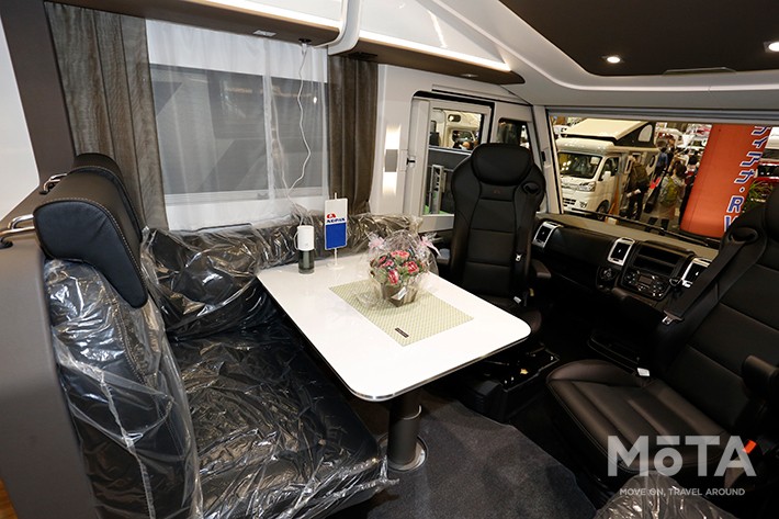 ドア正面はリビング。運転席・助手席は回転式で、リビングチェアとしても機能する。その運転席上部には電動式プルダウンベッドが仕込まれていて、2名の就寝が可能だ。