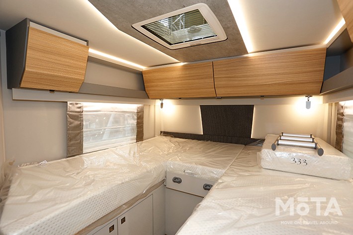 そして後部にはベッドルーム。左右配置のツインベッドだが、真ん中にエキストラベッドを置くことも可能だから、親子が川の字になって寝ることも出来る。