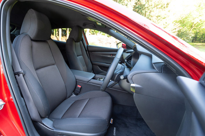 ただしMAZDA3のシートは優れているが、ドライバーが運転姿勢を正確に合わせることが不可欠だ。体をシートに密着させるように深く座り、リクライニング角度は若干立て気味に調節する。座面の前側を少し持ち上げて大腿部が離れるのを防ぎ、両脇を引き締めるとベストな運転姿勢になる。背もたれを寝かせ、浅く座るような誤ったルーズな座り方は受け付けない。