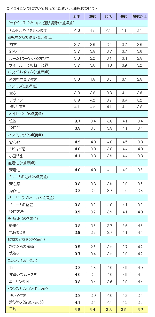 ・予想以上に小回りが利く。前方視界も良好なので、運転しやすい。不快ではないのだが、乗り心地は固め。後席であの振動は、ちょっとツライ。(下手だけどMT好きさん 宮城県 男性)