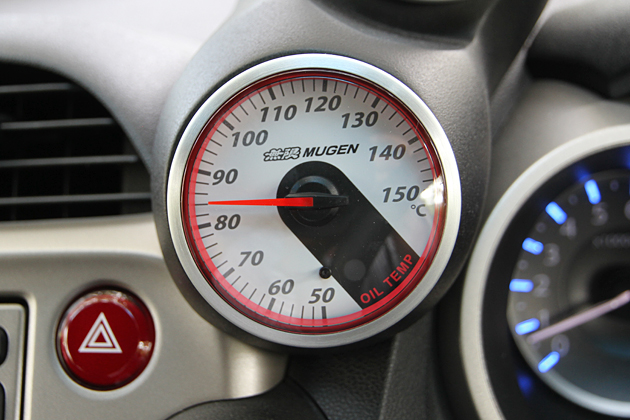 水温・油温の補助メーターをFIT専用メーターフードにセット。ドライビング中の視線移動を最小限に抑える位置にレイアウトし、さらにドライバー側にオフセットさせることで視認性も向上。メーターはφ60。センサー、専用ハーネス、コントロールユニットで構成。メーターフードはツヤ消しブラック塗装品/105,000円