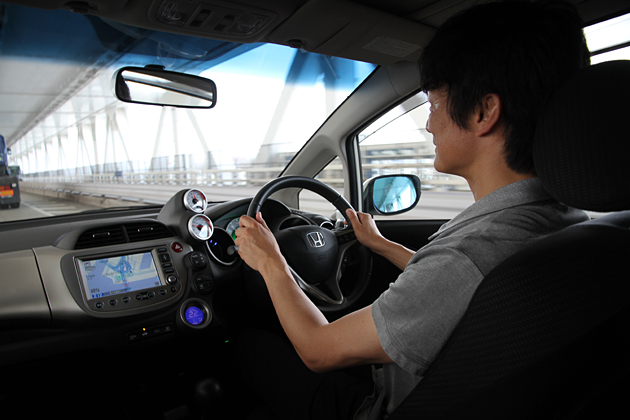 無限フィットハイブリッドに試乗する岡本幸一郎氏