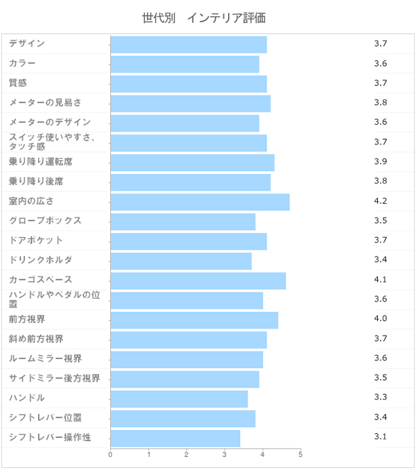 上記グラフで、注目点は2つある。第一に「質感」の高さだ。「デザイン」「カラー」とほぼ同等の点数。これは、コンパクトカーをベースとしたクルマとしては、上々の評価だ。ホンダは「フィットシャトル」のウリとして、インテリアの上質感を挙げている。