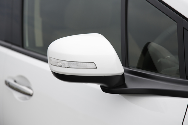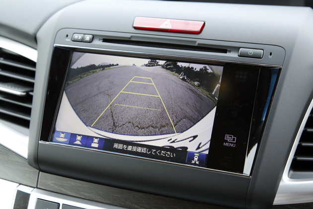 助手席側ドアミラー下のカメラ画像が映される「LaneWatch」。左ウィンカー操作時か、ウィンカーレバー先端に付いた「LaneWatchスイッチ」を押すことでナビ画面に表示される仕組みだ。