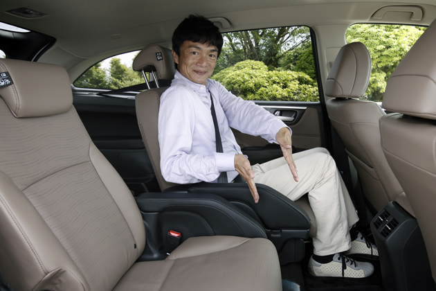 [身長172cmの岡本幸一郎さんが座るとこんな感じ・2列目シート(Vスライドキャプテンシート・後端スライド時)]