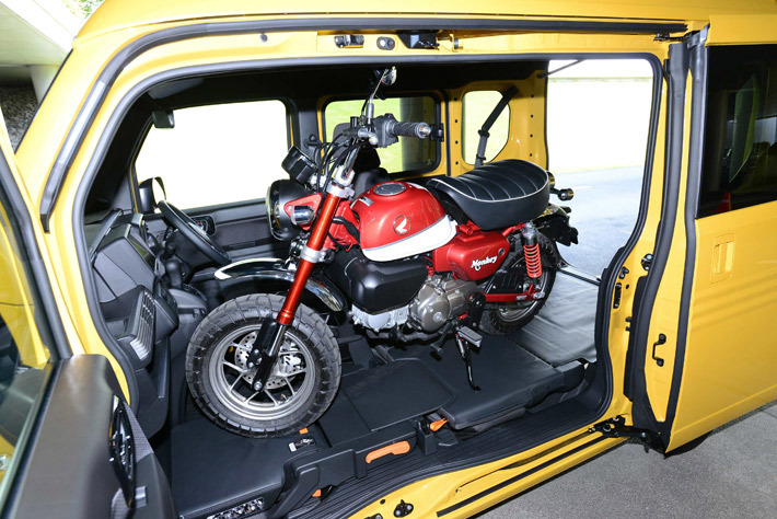 一方N-VANの荷室奥行きは最大で2635mmもあり、全長2mを超える大型バイクもラクに積載できるのではないだろうか。床面の低さもバイクを押して載せる際に有効に働く。ただし、N-VANの最大積載量は350kg(4WDは300kg)なので、その点は注意が必要だ。