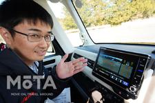 まずはGathersのカーナビにオプション設定されている「リアカメラ de あんしんプラス3(※)」装着車を試乗体験。この機能を説明してくれたのは開発部 NVD1ブロック アシスタントチーフエンジニアの佐藤亮さん。ユーザーが求めている機能を形にするスペシャリストです。