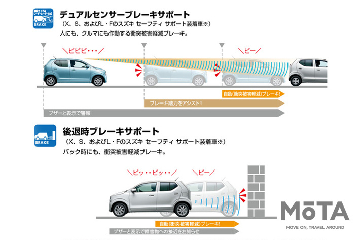 アルトは低価格の軽自動車だが、衝突被害軽減ブレーキは、カメラと赤外線レーザーをセンサーに使う。歩行者も検知して、緊急自動ブレーキを作動させる。買い得グレードは、これらの安全装備を標準装着したS(108万1300円)になる。