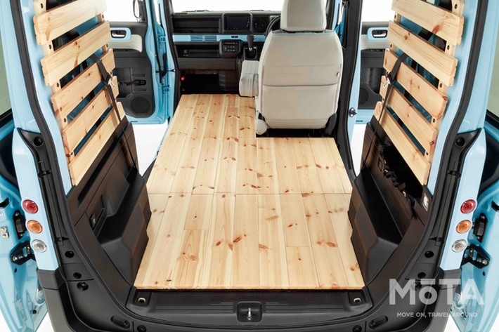 運転席以外のフロア全体を埋める天然材木のウッドパネルキット。取り外しも簡単で、用途によって組み合わせを選べます。