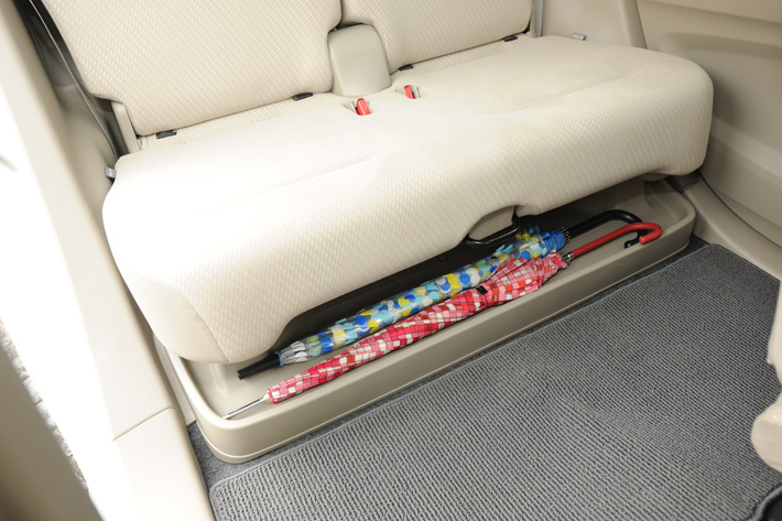 後席の下部には、旧型と同じく横長のトレイが備わり、傘や靴を収納できる。この装備は燃料タンクを前席の下に搭載する独自のレイアウトによるもの。旧型で人気の高かった部分は、新型にも受け継がれている。