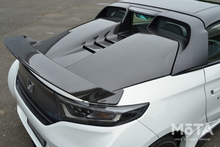 まるでかつてのホンダ NSX-R 02モデルを彷彿とさせるエアロパーツを身に纏った無限S660。ボンネット開口部には大きな穴が開けられ、その下にはフロントから入ってきたエアをきちんと抜くための大きなダクトが新たに備えられている。