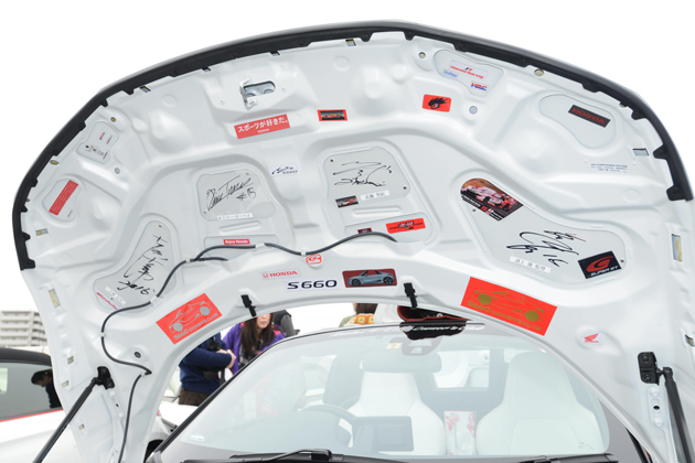 なんと、ホンダにゆかりのレーサーやチーム監督らの直筆サインがボンネットフード裏に貼られている!!