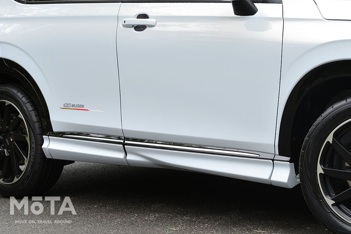 先のアーバンスタイルやカジュアルスタイルとは異なり、ボディ同色のフロントグリルを採用。グリル右側には無限のエンブレムをアクセントとしている。