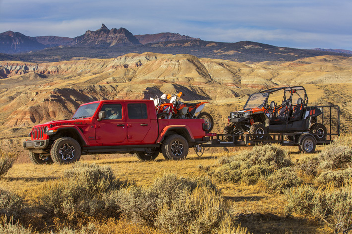 今回登場したグラディエーター、ピックアップトラックということで、最大積載量は約725kg。これはトヨタ ハイラックスの500kgを上回っており、ピックアップトラックを日常的にガシガシ使う、アメリカならではの設計思想が目立つ。具体的な寸法こそ公表されていないものの、前輪を外したロードバイクを積んだり、テールゲートを倒した状態でオフロードバイクを積んだりした写真があるので、長さは相当なものだ。さらに幅もボディいっぱいまで広げられており、単に「荷台をつけてみました」と言うだけでなく、本格的な積載性能を追求している点が伺える。