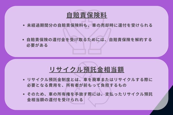条件によっては、車の売却の際に自動車税以外にも還付されることがあります。還付を受けられる可能性のある項目は、次の2つです。