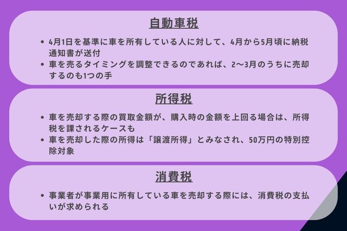 車を売却する際の税金に関して、次の3つの点に注意する必要があります。