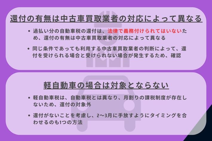 過払い分の自動車税の還付は、法律で義務付けられてはいないため、還付の有無は中古車買取業者の対応によって異なります。