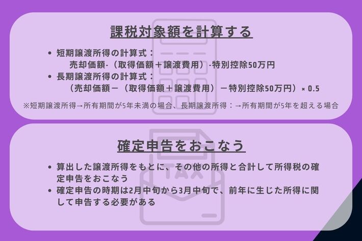 算出した譲渡所得をもとに、その他の所得と合計して所得税の確定申告をおこないます。確定申告の時期は2月16日から3月15日で、前年に生じた所得に関して申告する必要があります。